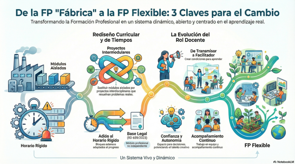 Y aquí surge una duda habitual. Muchos docentes de FP tememos que «la normativa» no nos permita innovar ni transformar nuestras clases. Sin embargo, el Real Decreto 659/2023 aborda de forma clara la flexibilización de horarios y la agilización del sistema: